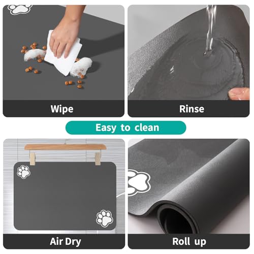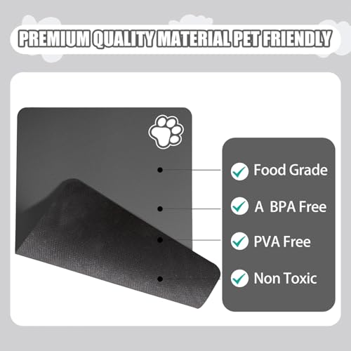 High absorbency combined with a quick-drying surface means accidents are contained and disappear sooner. The non-slip rubber backing holds the mat steady on hard floors while the waterproof bottom prevents liquid reaching the floor. The top surface repels cat hair and dust and does not build up tough-to-clean limescale like some silicone mats, so a wipe or a rinse restores its look. It rolls up for easy storage and is available in multiple sizes, which is especially useful in homes where cats nudge or knock bowls or where flooring needs extra protection.