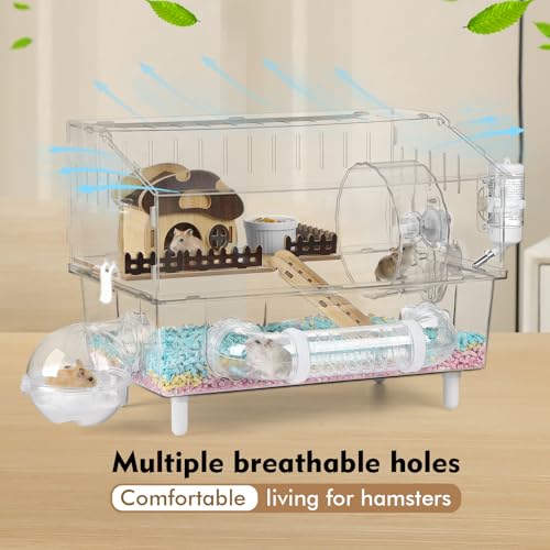 Acrylic hamster cage with accessories and two-layer design, providing a large, transparent habitat for dwarf hamsters and gerbils. The interconnected chambers offer 360-degree viewing and easy cleaning with removable bedding trays for simple maintenance.