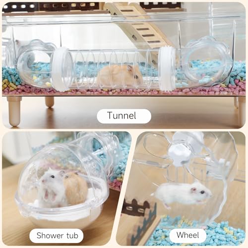 Looking for a compact, easy to monitor home for a dwarf hamster, gerbil or mouse? This two-layer acrylic habitat serves as a small animal cage and starter setup, combining transparent walls for 360 degree viewing with interconnected chambers and an included wooden hideout, exercise wheel, tunnels, food bowl, water bottle and a designated bathroom area. It is aimed at owners who want clear visibility of daily activity and a ready-to-use enclosure for indoor tabletop use.