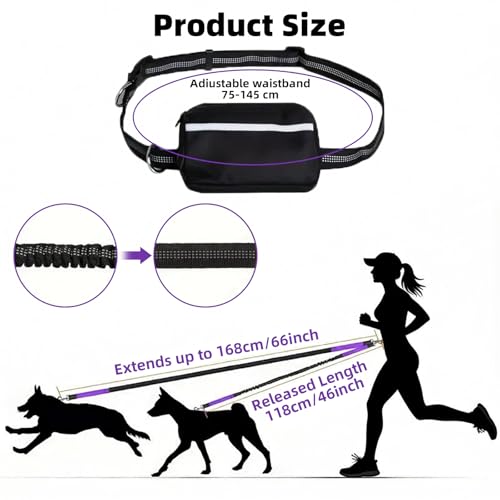The adjustable waist belt fits from 29.5″ to 57″. Each leash bungee stretches from 118cm (46.5″) to 168cm (66.1″), offering flexible reach for walking or running.