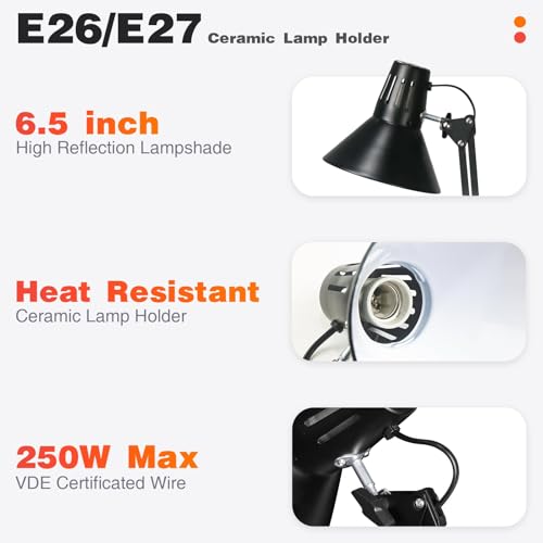 The lamp holder uses an E26/E27 ceramic socket that accepts ceramic heat emitters, infrared bulbs, UVB or LED lamps up to 250W, so you can match the bulb type to your species and enclosure goals. A folded, multi-angle swing arm and stackable rods let you change height and angle to produce a tight basking spot or a broader warm area. A reflective aluminium-lined shade improves heat and light direction, and a reinforced base with anti-slip pads helps reduce tipping. For best results use this with a thermometer or thermostat to monitor and control enclosure temperatures.