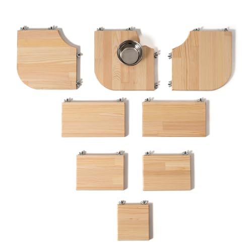 Made from kiln-dried pine with metal mounting hardware, the platforms provide stable surfaces for daily activity and allow flexible arrangement thanks to varying platform sizes. The built-in stainless steel feeding bowl reduces spill and is easier to clean than separate dishes. Quick, tool-free fitting means you can experiment with layout – for example place larger ledges lower for easy access and smaller ones higher to create exercise routes.