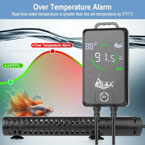 AQQA 500W fish tank heater for saltwater and freshwater aquaria rapidly reaches and maintains set temperature for 200-300L tanks. Its intelligent external controller with dry burning-resistant and overtemperature protection keeps water stable and protects fish.