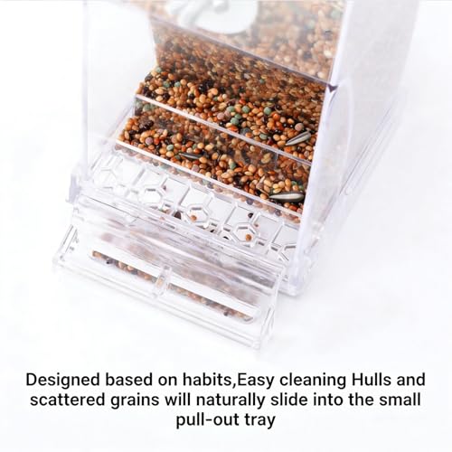 Automatic cage feeder for budgies and other small to medium birds, made from clear acrylic to monitor food levels easily. Its 16 oz (approx. 453 g) capacity and removable bottom tray cut mess and waste, simplifying refills.