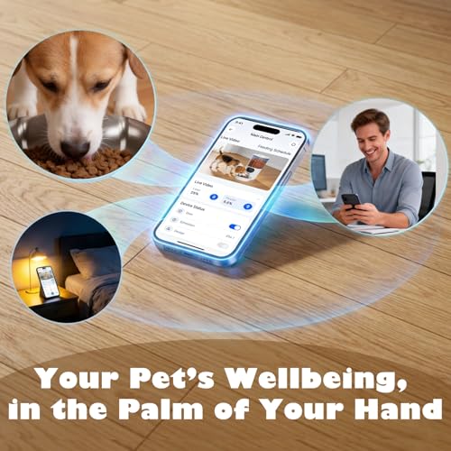 Use the app to schedule meals, monitor feeding behaviour and play a recorded meal call to keep routines consistent. The large 5 litre hopper reduces refills for short trips, while one-click and scheduled feeding options make mealtimes simple. The detachable design supports easy cleaning and the feeding logs help you track how often and how much your dog eats.