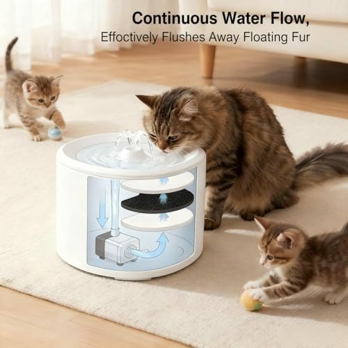Automatic 2.5L circulating water fountain for cats and dogs that provides fresh filtered water for several days, ideal for busy owners or multiple pets. Quiet pump and emergency tray help maintain hydration during power outages.
