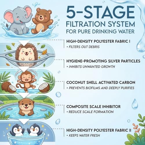 - Triple filtration – helps keep water clear and tasting fresh by removing hair, debris and odours