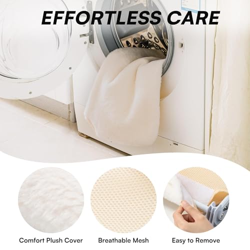 - Reversible washable cover with mesh and plush sides – breathable option for warm rooms and a cosy side for chillier conditions