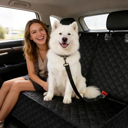 A practical dog car seat cover designed to protect your vehicle during travel. This car seat protector uses four fabric layers with a waterproof coating to shield rear seats from stains, moisture and scratches, while providing a comfortable space for dogs of small, medium and large sizes. The material is described as gentle and suitable for both dogs and children.