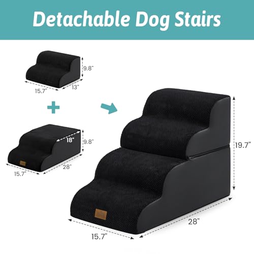 The steps use 30D high density sponge to give firm support while remaining soft under paws, which helps reduce repeated impact when your dog climbs up and down. The outer cover includes a waterproof TPU layer and can be removed for machine washing, while the foam core must not be washed. A non-slip nylon base keeps the unit steady and wear-resistant side panels protect against clawing. The product is lightweight with a carry handle, and the compressed packaging will smooth out after 24 to 48 hours; light ironing can remove any remaining wrinkles.