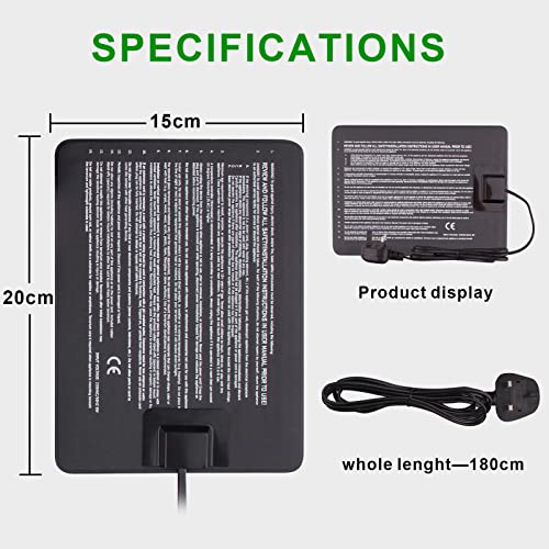 The mat measures 15 x 20 cm with 8 watt power and 220 volt supply; it is recommended for medium 10-20 Gal size enclosures.