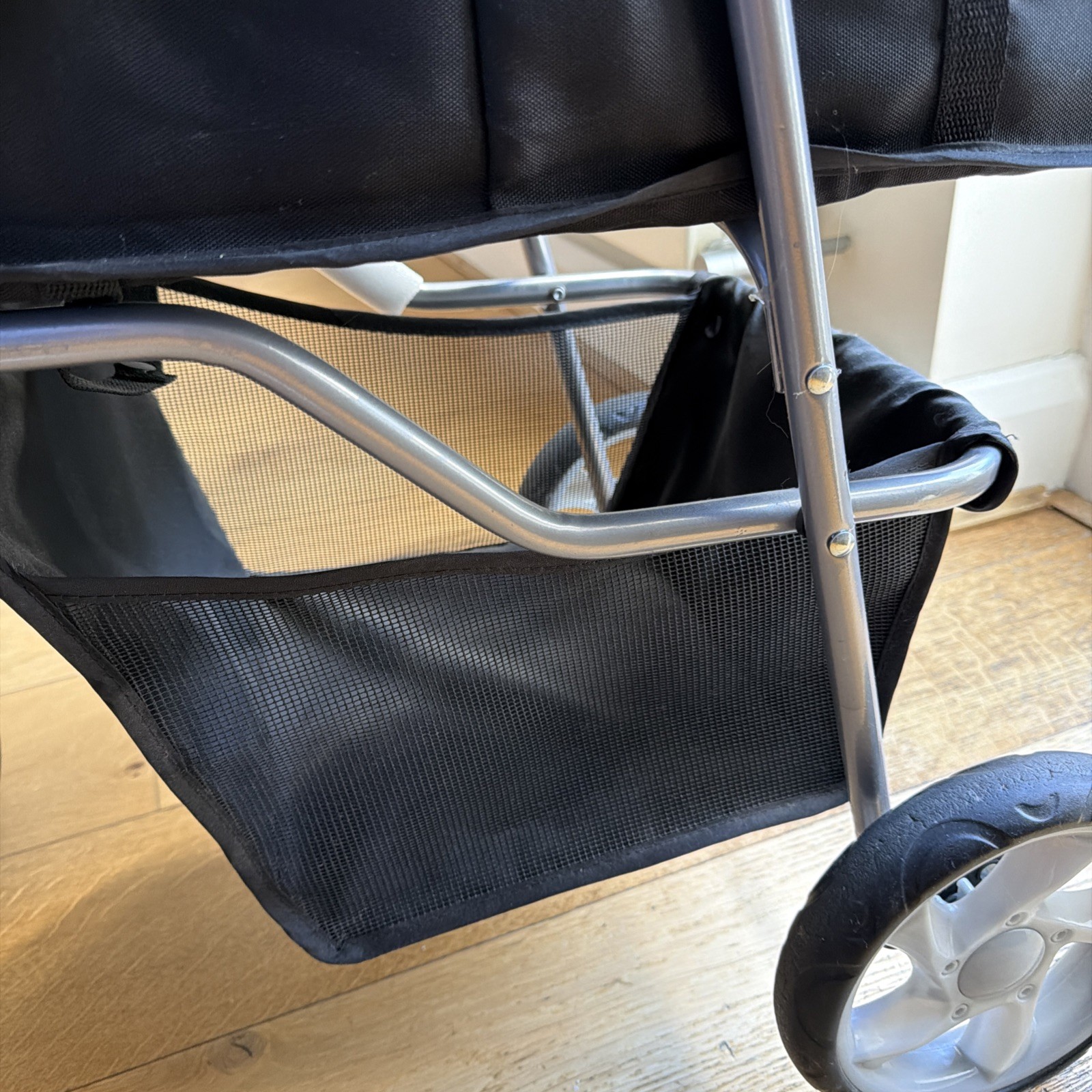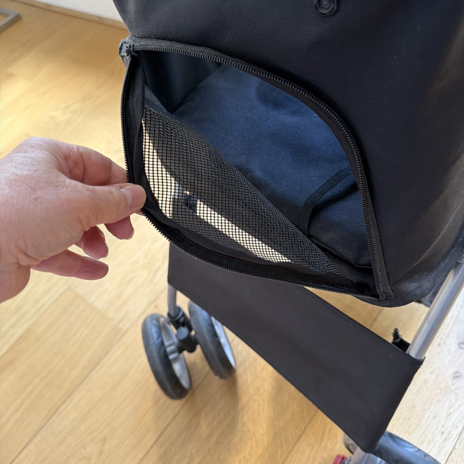 This four-wheeled dog stroller is designed for taking small to medium dogs on walks, shopping trips and travel. The enclosed compartment features mesh windows and a removable screen to provide airflow and visibility, while zippered access points and a small front door let you reach your dog without fully opening the canopy. The design also suits small cats when needed.