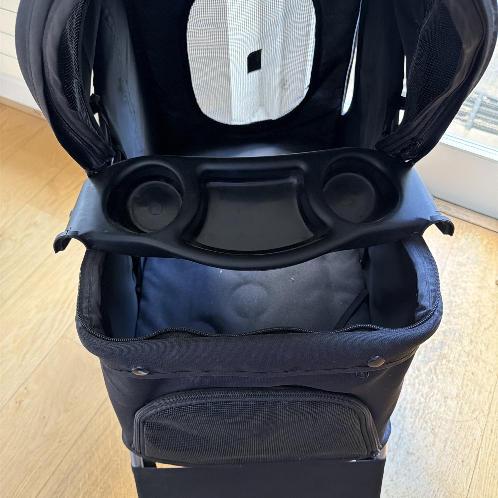 A foldable pet travel stroller for dogs and cats, offering roomy, ventilated protection for pets up to 30 lbs. Useful for travel or shopping, it features easy access panels, a cup holder and under-seat storage for essentials.