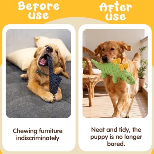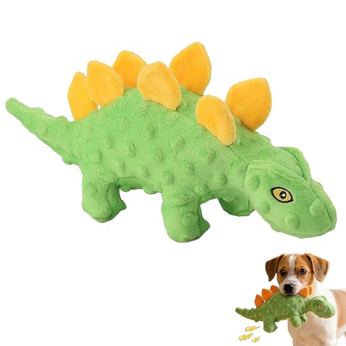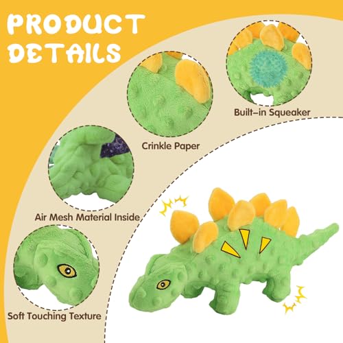 Squeaky plush dinosaur toy for dogs and teething puppies, combining an upgraded internal whistle and crinkle paper to engage play and chewing instincts. Soft yet durable for small and medium breeds, it helps entertain and reduce destructive chewing.