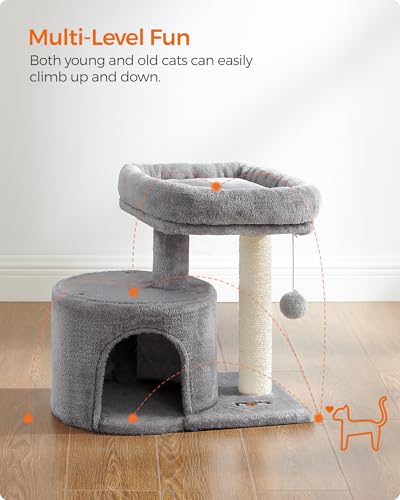 A compact cat tower for kittens and cats, the Feandrea PCT50WV1 combines a fully wrapped sisal post for scratching with a plush perch and cosy cuddle cave for rest and play. Stable construction and simple assembly make it practical.