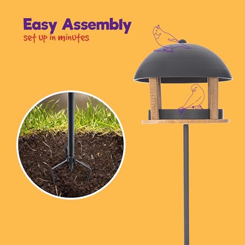 Practical design choices keep maintenance simple. The large wooden platform has a metal rim to stop seed being spilled over the edge, reducing waste and mess on the lawn. Assembly uses only a few parts and ground spikes anchor the unit into lawn grass or other soft ground, so it works best in gardens with soil rather than hard paving. The raised table helps keep food drier and cleaner for feeding birds.