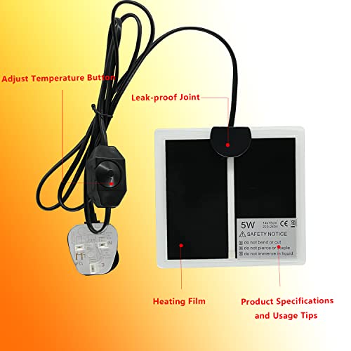 Fit the mat to the bottom or side of a glass tank and always use it with a thermostat, placing the probe closest to the mat for accurate control. The mat is designed for slow heating to reduce overheating, so allow around 30 minutes for an accurate temperature reading and adjust the controller if a cold glass tank is causing heat loss. It is removable and slightly damp-proof rather than submersible, does not use adhesive paper and should not be covered with non-thermally conductive materials such as wood chips or towels. Do not place animals directly on the pad; note there is no digital display on the dial and the package does not include rubber spacers.