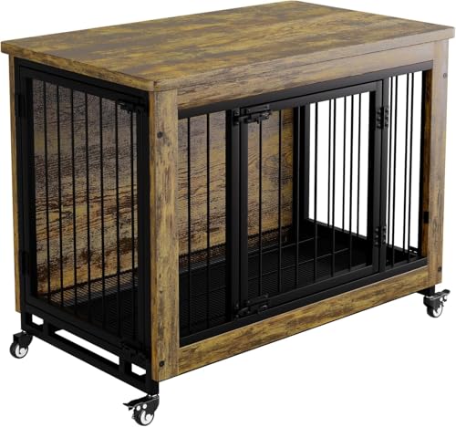 This heavy duty rustic wooden dog crate furniture serves as an indoor kennel and stylish side table for small to medium dogs. Its chew-resistant metal cage, removable tray and lockable wheels provide security, easy cleaning and mobility.