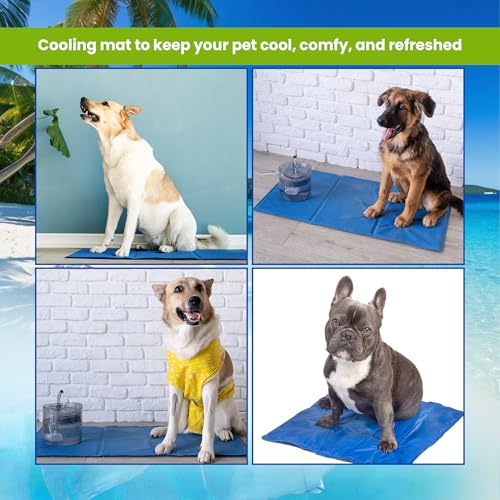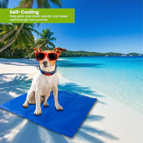 Self-cooling pad for dogs, activated by body weight and heat to soothe without refrigeration or electricity. Spacious enough for medium to large dogs and reusable for indoor, outdoor, crate and car travel, with puncture-resistant, non-toxic fabric that wipes clean.