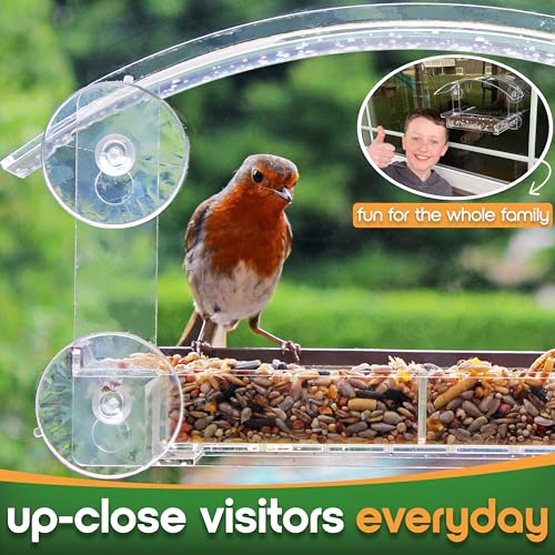 A window-mounted bird feeder for attracting birds to your window, ideal for bird watching. It uses powerful suction cups that will not fall and has a removable seed tray for quick refills and cleaning.