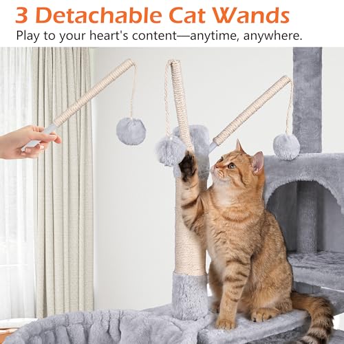- Interactive toys included – detachable teaser wands and hanging plush balls encourage chasing and play.