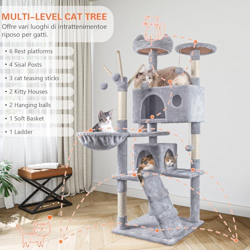 A 151cm HOMIDEC cat tree for adult cats offering sturdy climbing, padded resting spots and natural sisal posts to protect furniture. It suits multi-cat households and includes cosy houses, a hammock and teaser wands for play.