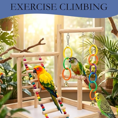 Interactive bird toys with a 6-rung ladder and colourful rings for parrots and budgies, providing physical activity and mental stimulation to reduce boredom. Lightweight, durable design suits standard cages and allows easy rotation for ongoing enrichment.