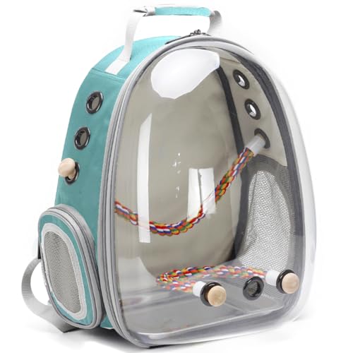 Space capsule style bird backpack carrier for parrots, budgies and cockatiels with a transparent bubble window that protects and lets you take birds to the vet or outdoors. Hands-free padded straps with chest buckle and included perch and tray make transport safer and more comfortable.