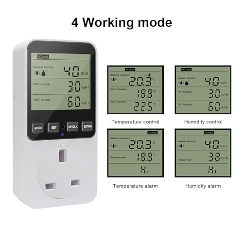 Simple to programme: set start and stop humidity or temperature and choose mode. It saves settings after power failure and offers ℃/℉ and audible button options.