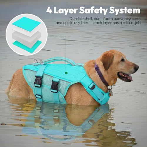 The outer shell is made from tear-resistant ripstop fabric with breathable 3D mesh panels to help prevent overheating during extended wear. Quick-release buckles allow fast on and off, which is useful for puppies or anxious dogs. A sturdy rescue handle gives secure control when lifting from the water and integrated reflective strips increase visibility in low light. The materials rinse clean and dry quickly for simple maintenance.