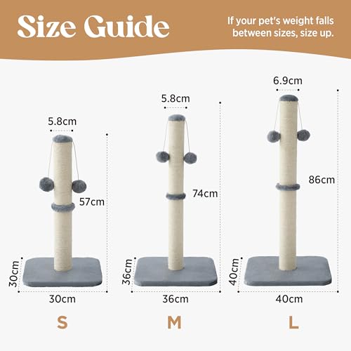 Practical features include a thick sisal-wrapped post that provides a rough texture cats enjoy for filing claws and a weighted wooden base covered in soft plush to help prevent wobble during use. The plush base also creates a low resting spot while the vertical post supports full-body stretches. Assembly is straightforward so the post can be ready for use quickly after unboxing.