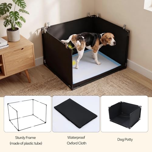 Built from odourless, non-toxic PP, the semi-enclosed design offers a den-like space for anxious or shy dogs while remaining open on top for airflow. The unit has a low-entry base for smaller or older dogs and taller sides so larger dogs can pee naturally against a wall. It assembles without tools, folds flat for storage and the top clips secure a standard pee pad in place for added stability. Pee pads are sold separately.
