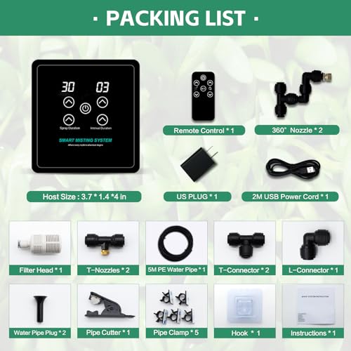 - Programmable timing – spray duration adjusts in 5 second steps and stop interval adjusts in 1 hour steps for repeatable humidity cycles