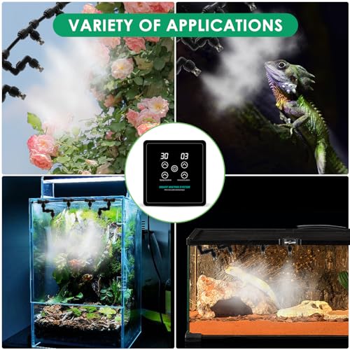 This system is suitable for tropical species listed in the product information such as chameleons, snakes, frogs, turtles and other lizards and amphibians kept in humid enclosures. Practical note for buyers – because this is a timer-based mister rather than an automatic humidistat, pair it with a hygrometer or humidity controller if you need precise relative humidity control. It is also useful for greenhouse or plant watering tasks where intermittent misting is required.