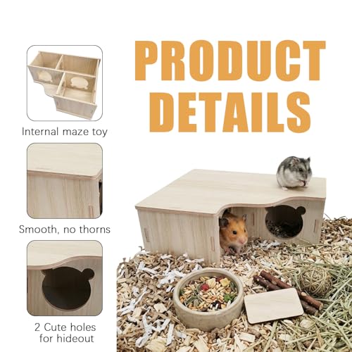 Natural wooden multi-chamber house for hamsters and other small animals, providing connected tunnels and cosy hides for exploration and rest. Smooth, non-toxic wood with a removable lid makes cleaning and health checks simple.