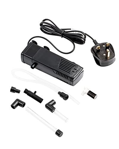 The unit includes biological filter media and the pipework needed for installation, and it assembles and disassembles quickly to make routine maintenance easier. A detachable spray bar can be used to create surface movement, act as a gentle wave maker or add extra aeration where required. It is also suited to odd-shaped or shallow habitats because it can be mounted horizontally or vertically and fully submerged, and the supplied suction cups help secure placement inside the tank.