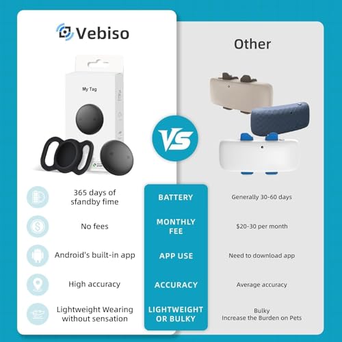 Lightweight GPS tracker for dogs and cats that connects to Google Find My Device on Android 9+ for real-time location without monthly fees. Its IP68 waterproof holder and replaceable CR2032 battery offer durable, low-maintenance tracking.