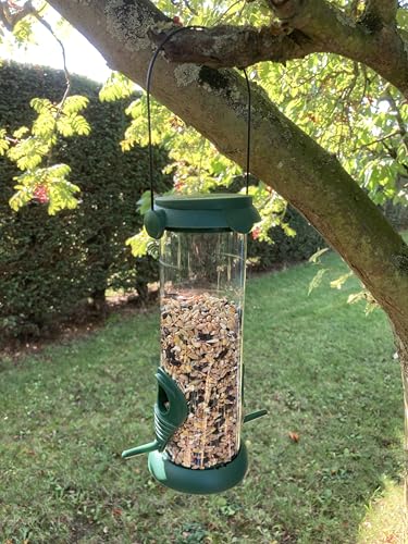 Smooth surfaces and a simple shape mean cleaning is straightforward, which helps keep seed dry and reduces the chance of mould between fills. The dual perch allows more than one bird to feed at once and gives better viewing from a window or patio. For best results hang the feeder in a sheltered, elevated spot where you can watch comfortably and check seed levels more frequently during cold weather when birds forage more often. This design suits families and anyone new to birdwatching.