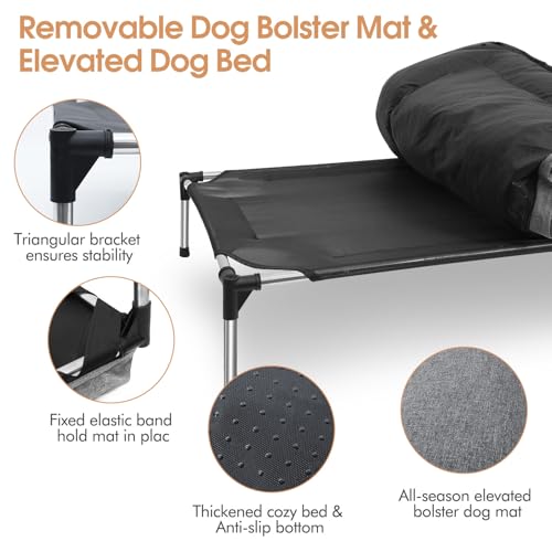 The design combines a breathable Teslin mesh mat with a removable pillow-top cushion and plush bolster. The sloping headrest gives dogs a comfortable place to rest their head, while low guardrails help prevent falls and stop blankets or toys from spilling onto the floor. Reinforced corners and non-slip rubber feet improve stability, and the cushion cover is machine washable for easy care. The bed mat can be wiped clean or rinsed with a hose, and assembly is quick with the included tools.
