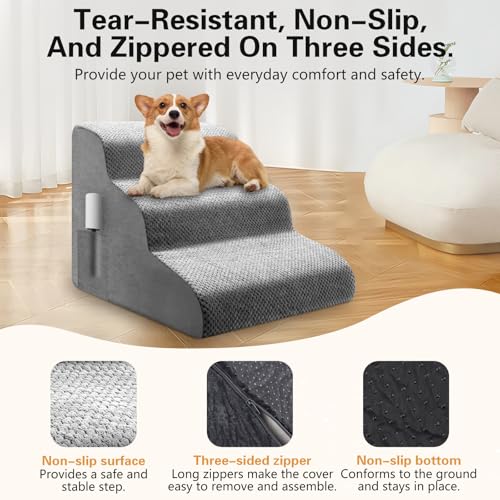 The steps use 30D high-density foam for cushioned support and a corduroy fabric surface to improve paw grip. Rubberised nubs on the base increase stability and reduce slipping on floors. A removable, waterproof cover with TPU protection can be machine washed for simple upkeep. No assembly is required, so the stairs are ready to use straight away.