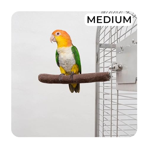 The textured surface mimics natural bark and offers controlled abrasion that helps trim nails safely without harsh tools. It also encourages natural gripping exercises that support foot strength and balance, especially when used alongside rope or plain wooden perches for variety. Made from natural sand, wood and metal with a non-toxic coating, the perch is more durable than a sandpaper-wrapped branch and stays hygienic when installed with the simple butterfly bolt fitting. Choose this medium perch for small to medium parrots and similar species, and locate it where your bird perches most to get the greatest nail-wearing benefit.