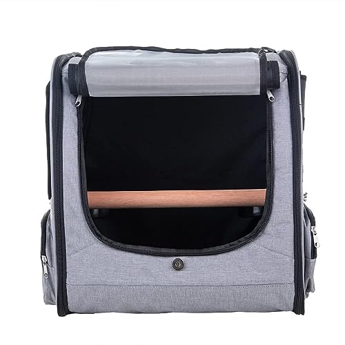Looking for a secure bird carrier for outings and longer journeys? This parrot travel cage works as a comfortable backpack carrier that lets you take small to medium parrots such as budgies, cockatiels, African grey, conures, caiques and senegals with you for walks, visits or longer travel. The transparent front gives your bird a view while keeping it contained and protected.