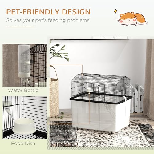 A two-tier PawHut hamster and gerbil cage that provides roomy, active space with ramp and included food dish and 125ml water bottle. Deep base and four wheels make cleaning and relocating the enclosure straightforward and convenient.
