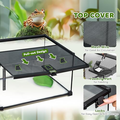 The wire mesh top provides adequate ventilation while the pull-out top cover includes a feeding port, making access and feeding straightforward without needing to fully open the enclosure.