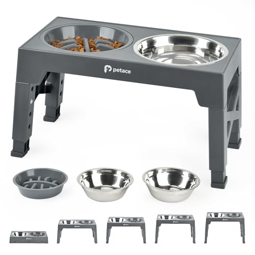 Petace elevated dog bowl stand for dogs, adjustable to five heights to suit puppies through large breeds and including two stainless steel bowls plus a slow feeder. It helps reduce joint stress and slows eating.