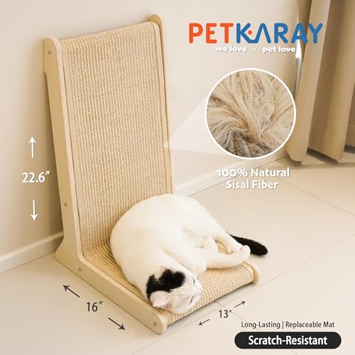 The PETKARAY 105° Sisal Cat Scratcher is a 57cm high L-shaped floor-mounted scratching post for indoor cats. Its 105° angle reduces pressure on the cat’s spine and the natural sisal surface, plus included catnip, helps protect furniture while lasting for years.