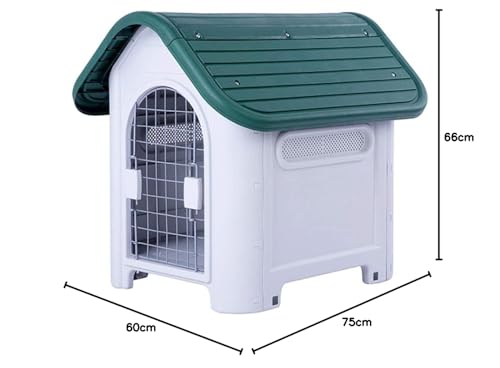 This weatherproof plastic dog house is a simple indoor and outdoor kennel solution for small and medium dogs. Designed as a shelter for garden or home use, it includes a removable door and continuous front and rear ventilation slots to keep air moving. Use the kennel as a quiet resting spot outdoors or as a washable sleep space inside.