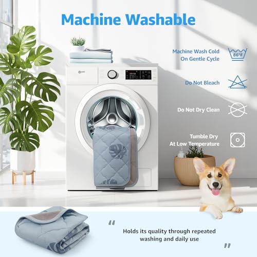Built with a five-layer construction, the mat combines a cooling surface with soft internal padding and a waterproof layer to protect against drool and spills. A non-slip base keeps the mat secure on tile, wood and car floors, so it does not shift when a dog moves. It is machine washable and packs flat for storage, and any creases from vacuum-sealed packaging wash out in a cold wash.