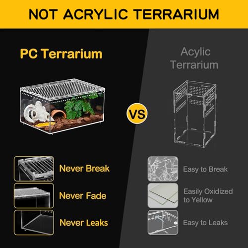 PC reptile terrarium suitable for beginners, ideal for geckos and tarantulas; one-piece moulded design requires no assembly and offers high transparency and easy cleaning, with a sliding top and ventilation for small reptiles and invertebrates.