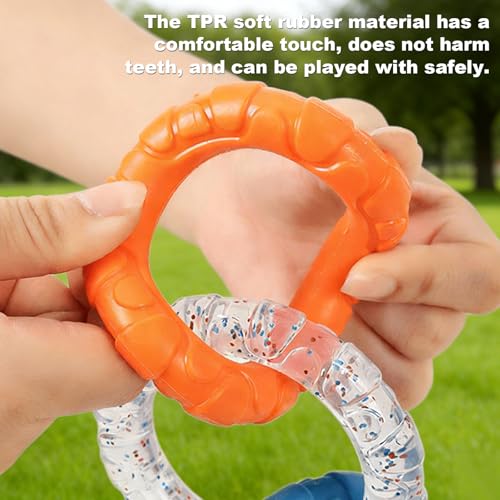 The textured surface helps clean teeth by removing plaque and massaging gums, which can ease teething discomfort for young dogs. The three-ring layout creates easy gripping points for owners and dogs during tug games, boosting interaction. It rinses clean with water and the visually engaging design helps redirect chewing away from furniture and footwear.